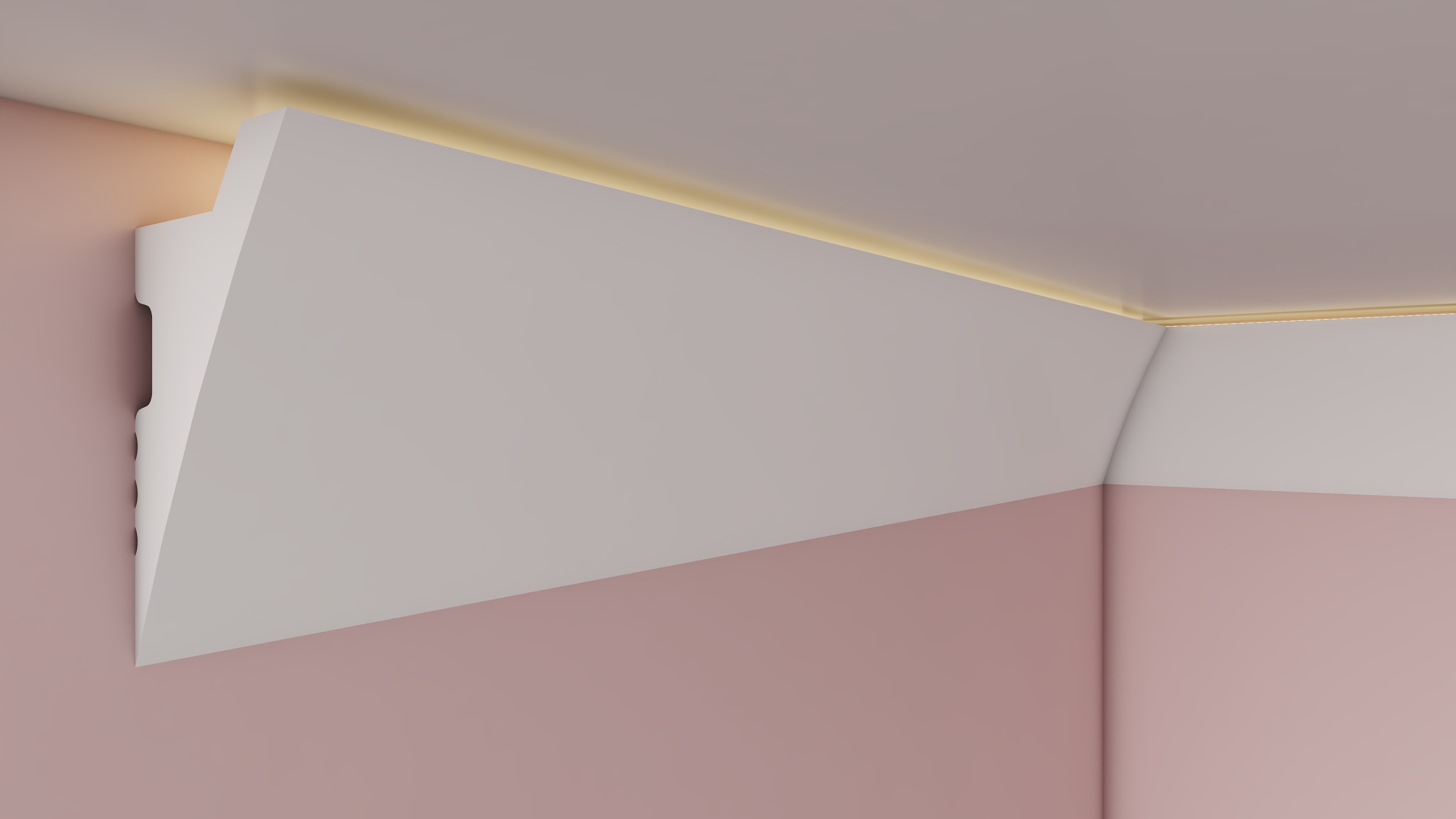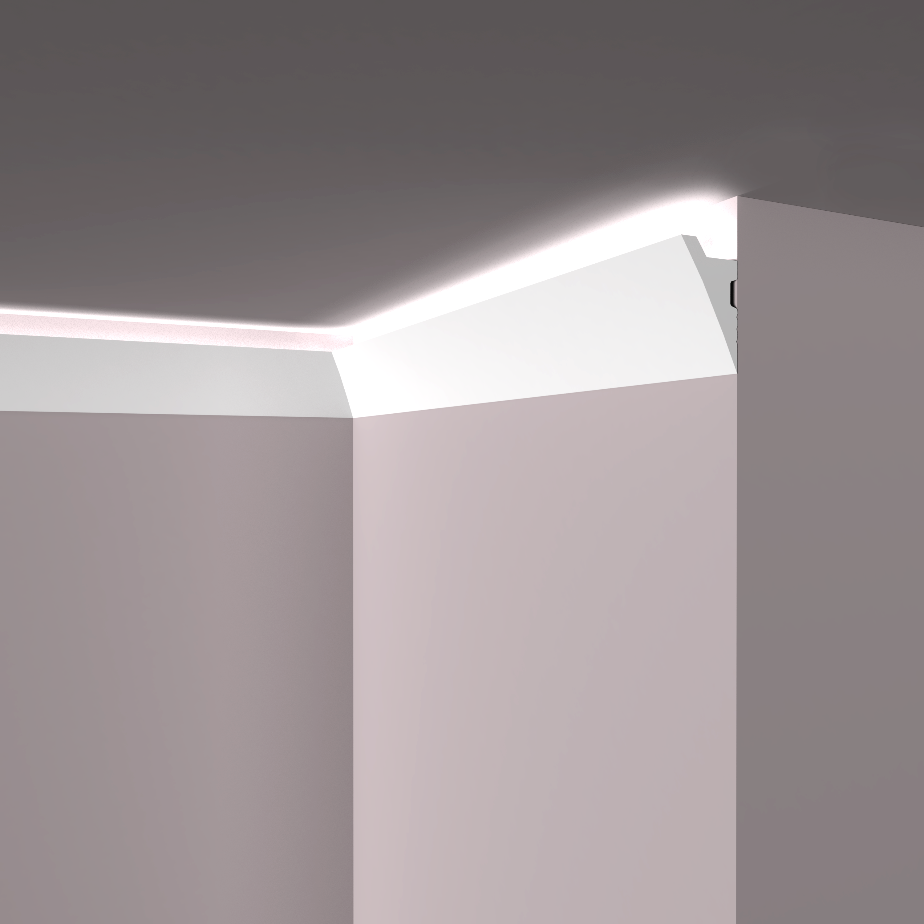 Unsere stilvoll gestalteten Deckenleisten sind für jede Raumgestaltung geeignet. Das zeitlose und moderne Profildesign sorgt für ein harmonisches Gesamtbild und eine nahtlose Verbindung von Wand und Decke. In der Nut dieser Leisten können flexible LED-Streifen eingefügt werden. Die indirekte LED-Beleuchtung schafft eine warme und einladende Atmosphäre. Passendes LED-Zubehör ist ebenfalls in unserem Shop erhältlich.