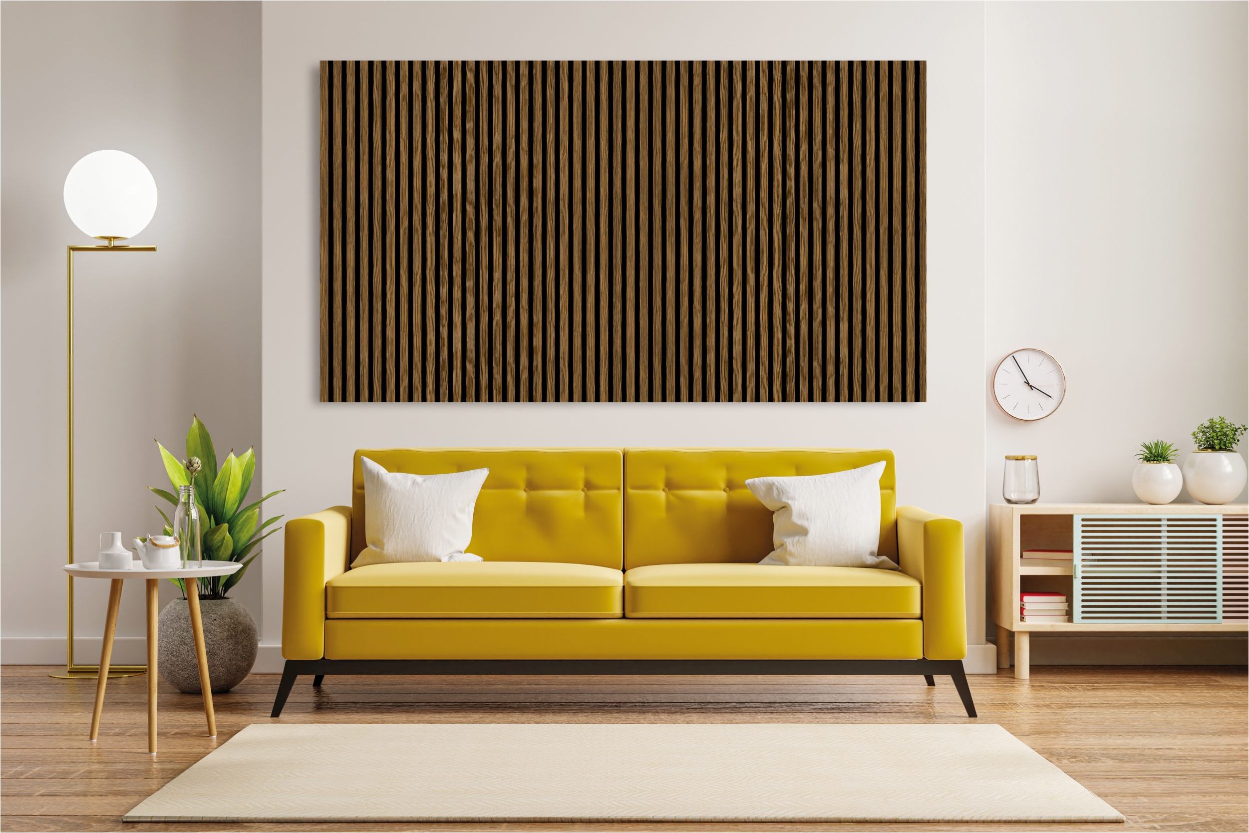 Funktion trifft Design: Diese Akustikpaneele vereinen stilvolles Wanddesign mit spürbarer Schallreduzierung. Mit MDF-Lamellen auf einem nachhaltigen PET-Trägermaterial gefertigt, bringen sie Ruhe, Struktur und Ästhetik in jeden Raum. Ob im Wohnzimmer, Büro oder in der Gastronomie. Die Akustik Wandpaneele schaffen Atmosphäre mit Wirkung.