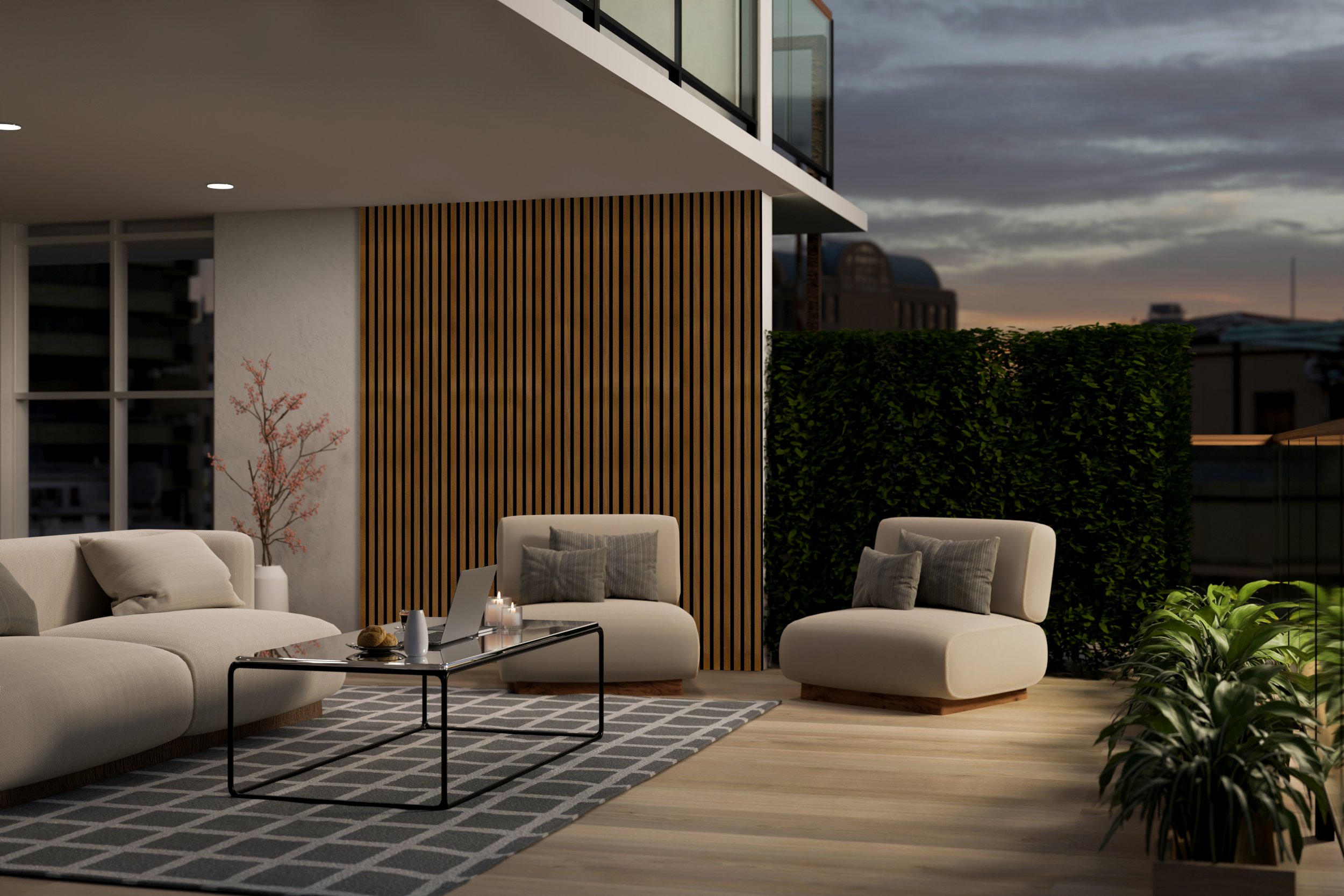 Mit den Thermoholz Akustikpaneelen gestaltest Du Außenbereiche nicht nur stilvoll, sondern auch funktional. Die thermisch behandelten Echtholzlamellen aus Fichte und Kiefer bringen eine warme, natürliche Optik an Fassade, Terrasse oder Balkon und sorgen gleichzeitig für spürbare Schallreduktion. Langlebig, wetterfest und resistent gegen Pilze und Insekten: Diese Paneele sind die perfekte Kombination aus Design, Funktion und Natur.