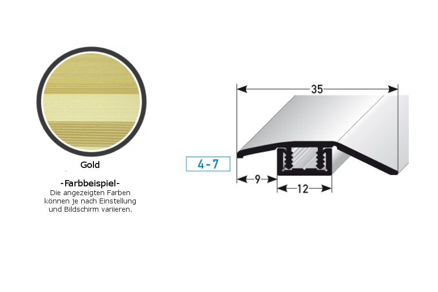 - GRÖSSE: Das Ausgleichsprofil mit den Abmessungen 35 x 4 - 7 x 900 mm hat eine Einfasshöhe von 4 - 7 mm.