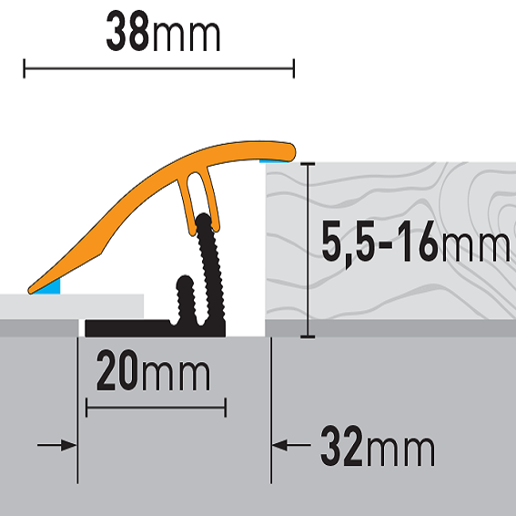 - GRÖSSE: Das Ausgleichsprofil mit den Abmessungen 10.23 x 38 x 930 mm hat eine Einfasshöhe von 5.5 - 16 mm.