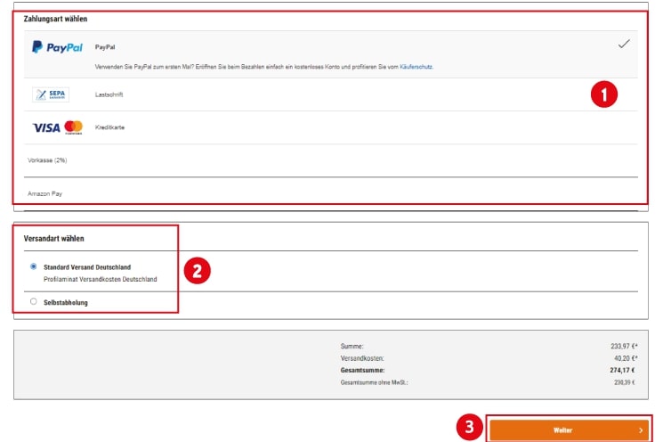 (1) Wähle Deine gewünschte Zahlungsmethode aus. Folgende Zahlungsarten stehen Dir zur Verfügung: PayPal, SEPA Lastschrift, Kreditkarte, Vorkasse, Klarna und Amazon Pay.