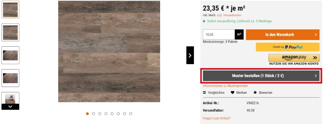 Auf der Produktdetailseite hast Du die Möglichkeit das Muster im Warenkorb abzulegen indem Du auf den Button "Muster bestellen" klickst. Es öffnet sich ein Fenster, über das Du den Bestellprozess fortsetzen kannst. Klick dazu auf den Button "Zur Kasse". Für einen schnelleren Check Out Prozess kannst Du auch direkt per PayPal oder Amazon Pay bezahlen. Der Bestellablauf für Muster erfolgt von da an in den gleichen Schritten, wie eine reguläre Bestellung: Gib alle notwendigen Daten an und schließe die Bestellung mit dem Klick auf den Button "Zahlungspflichtig bestellen" ab.