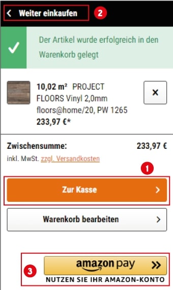 (1) Um die Bestellung fortzusetzten, klick auf den Button "Zur Kasse". (2) Wenn Du weitere Artikel aus unserem Shop bestellen möchtest, dann klick auf "Weiter einkaufen". (3) Für einen schnelleren Check Out Prozess kannst Du auch direkt per PayPal oder Amazon Pay bezahlen.