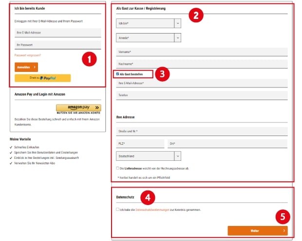 (2) Du bist Neukunde: Registriere Dich, indem Du alle Pflichtfelder ausfüllst und mit dem Klick auf den Button "Weiter" Deine Registrierung abschließt.
