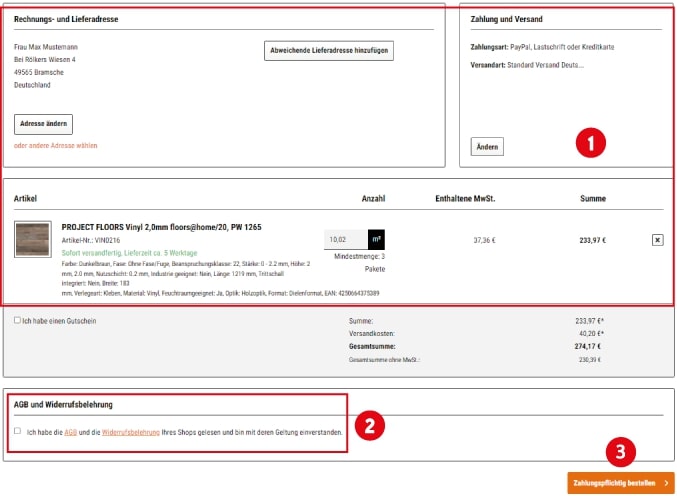 (1) In der Bestellübersicht siehst Du eine Zusammenfassung Deiner Bestellung. Hier hast Du noch einmal die Möglichkeit alle Angaben zu überprüfen und ggf. zu ändern. (2) Hast Du einen Rabatt Code kannst, kannst Du diesen hier auch eingeben.