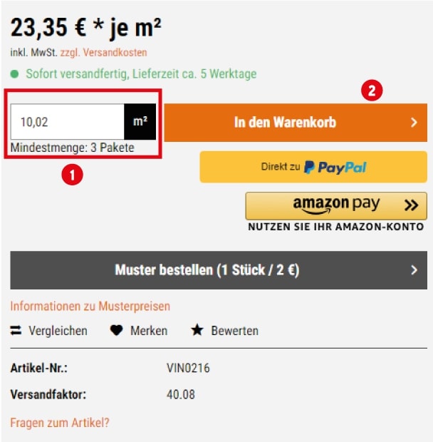 (1) Gib die gewünschte Menge ein. (2) Füge Deinen Wunschartikel mit Klick auf "In den Warenkorb" zu Deinem Warenkorb hinzu. Es öffnet sich ein kleines Fenster, über das Du den Bestellprozess fortsetzen kannst.