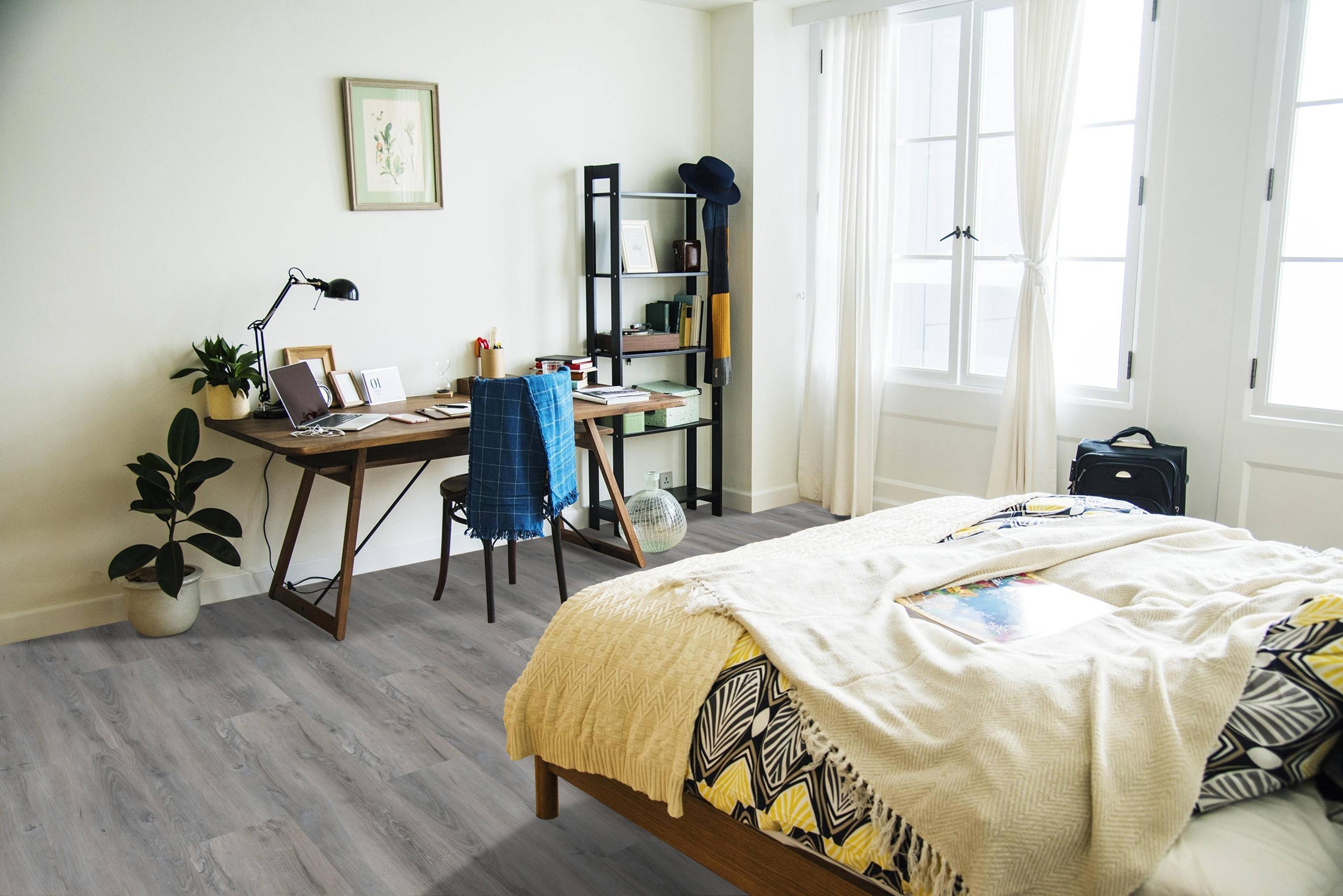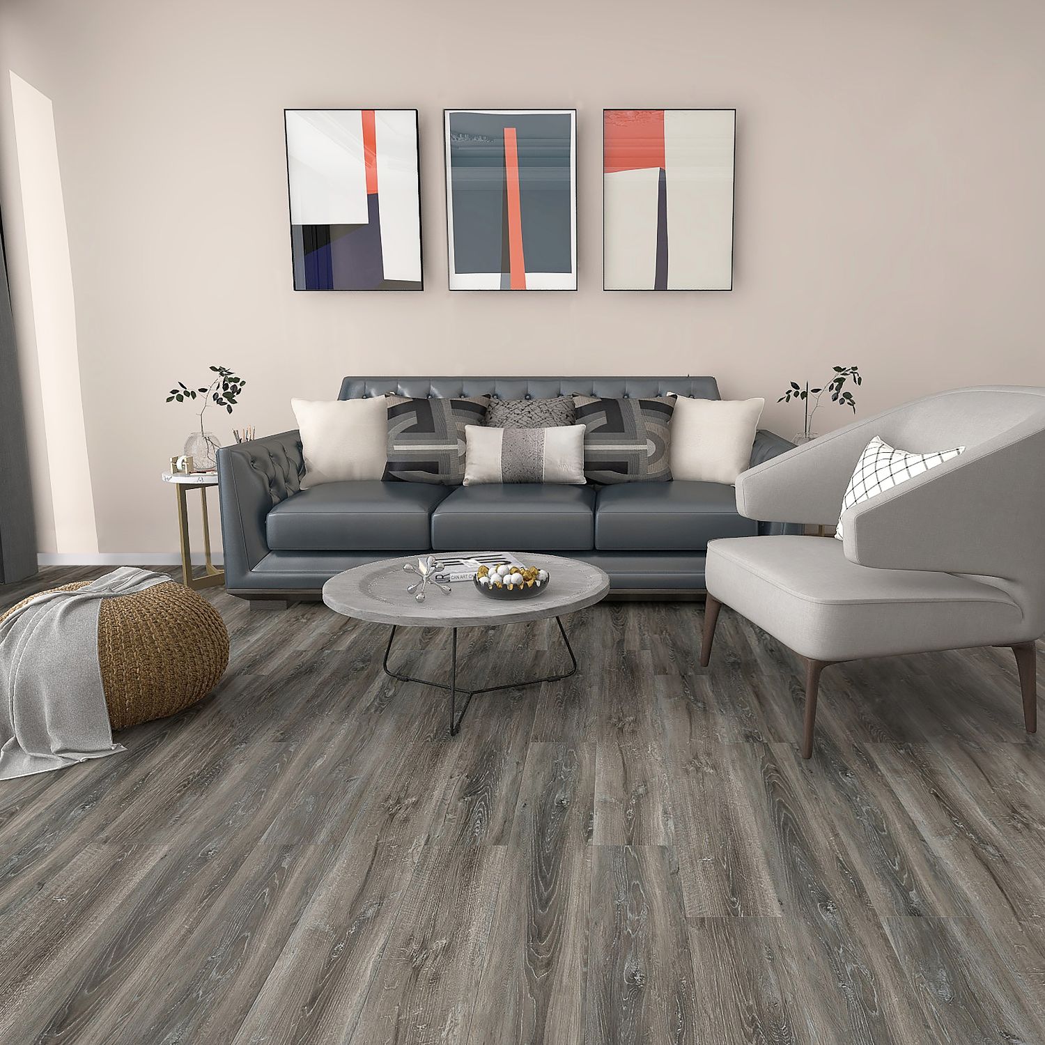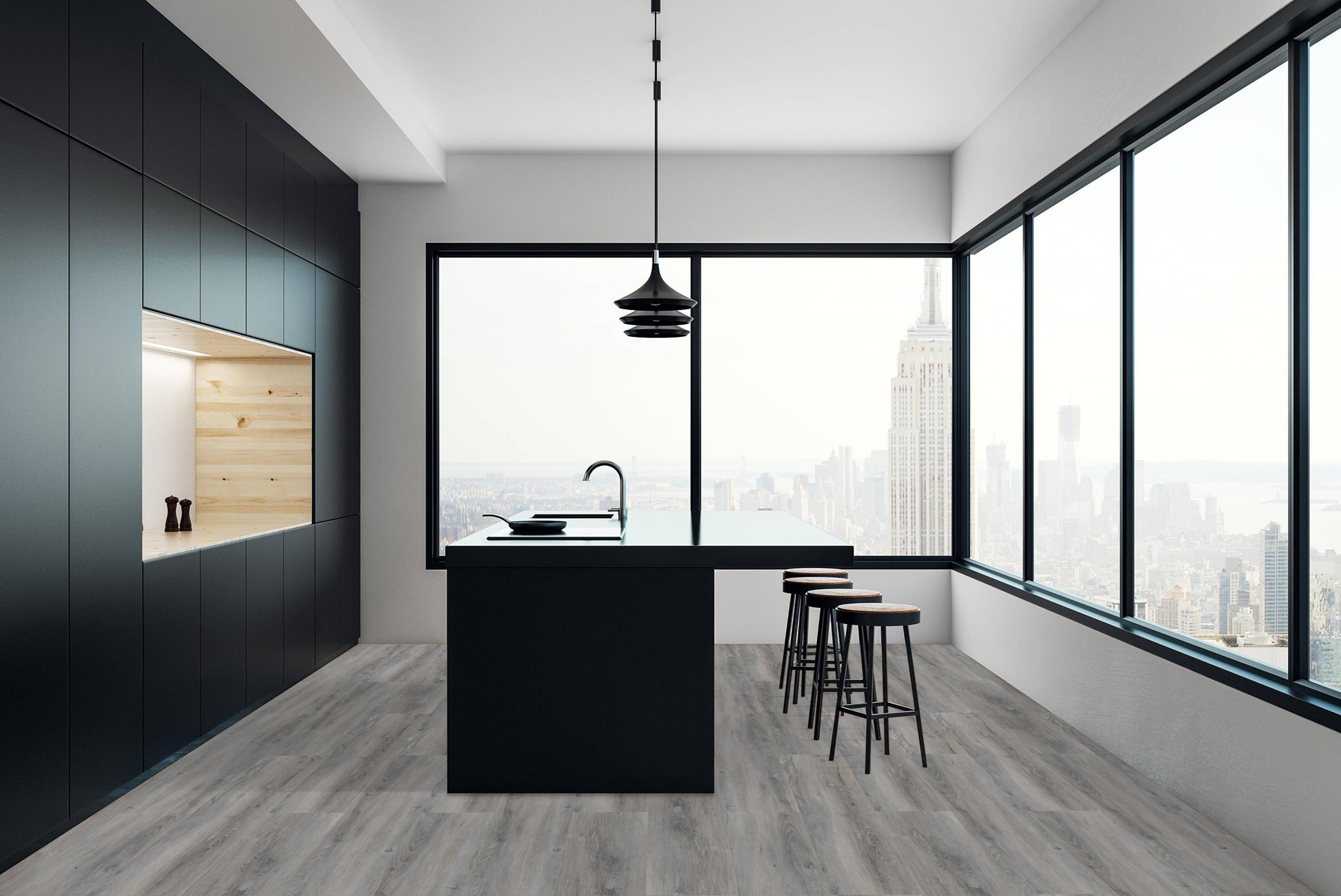Ein harmonisches Grau für zeitlose Schönheit: Unser Vinyl Designboden in Eiche Grau verleiht deinem Raum eine ansprechende Ruhe und Eleganz.