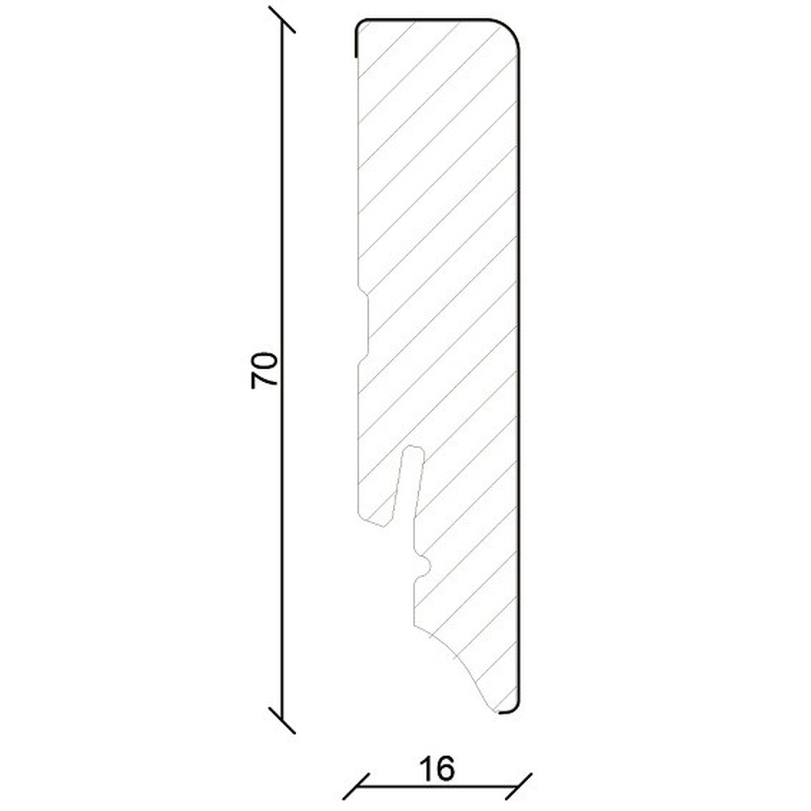 - GRÖSSE: Die Fußleiste mit den Abmessungen 16 x 70 x 2400 mm schafft einen sauberen Übergang zwischen Boden und Wand.