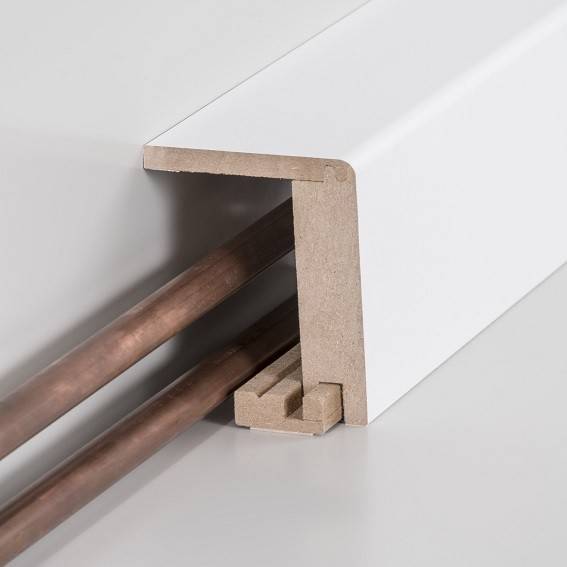 Diese Heizrohrabdeckleiste besticht vor allem durch das moderne und schlicht gestaltete Profil. Das schnörkellose klare Design ist zeitlos und lässt Rohre formschön abdecken. Dank des festen strapazierfähigen MDF-Kerns ist die Fußleiste besonders langlebig wodurch Sie umso länger Freude daran haben werden.