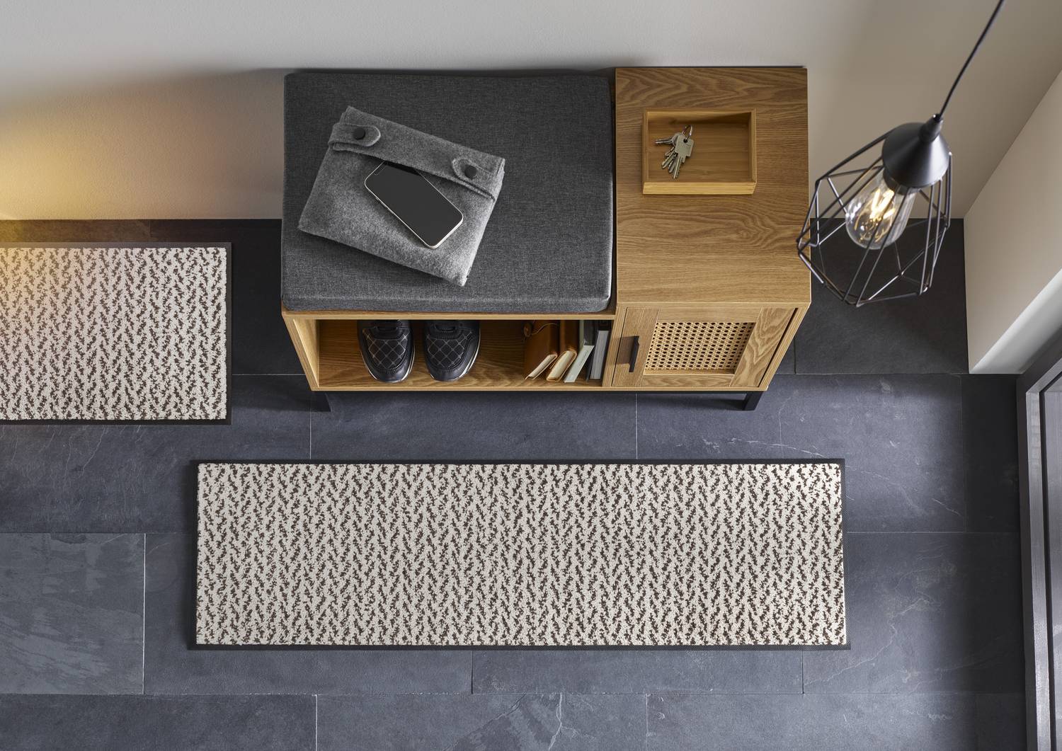 Ob im Flur, in der Küche, im Kinderzimmer oder Wohnzimmer: Die Floornovo Eco Line Matten sorgen überall für Sauberkeit und ein gutes Gewissen. Das zweifarbige Fischgrätenmuster verleiht jedem Raum eine besondere Note und fügt sich harmonisch in verschiedenste Einrichtungsstile ein. Der robuste Nitrilgummirücken hält die Matte sicher an Ort und Stelle, während die hohe Schmutzaufnahme und leichte Pflege die Reinigung unkompliziert machen - ideal für Allergiker und Tierhalter.