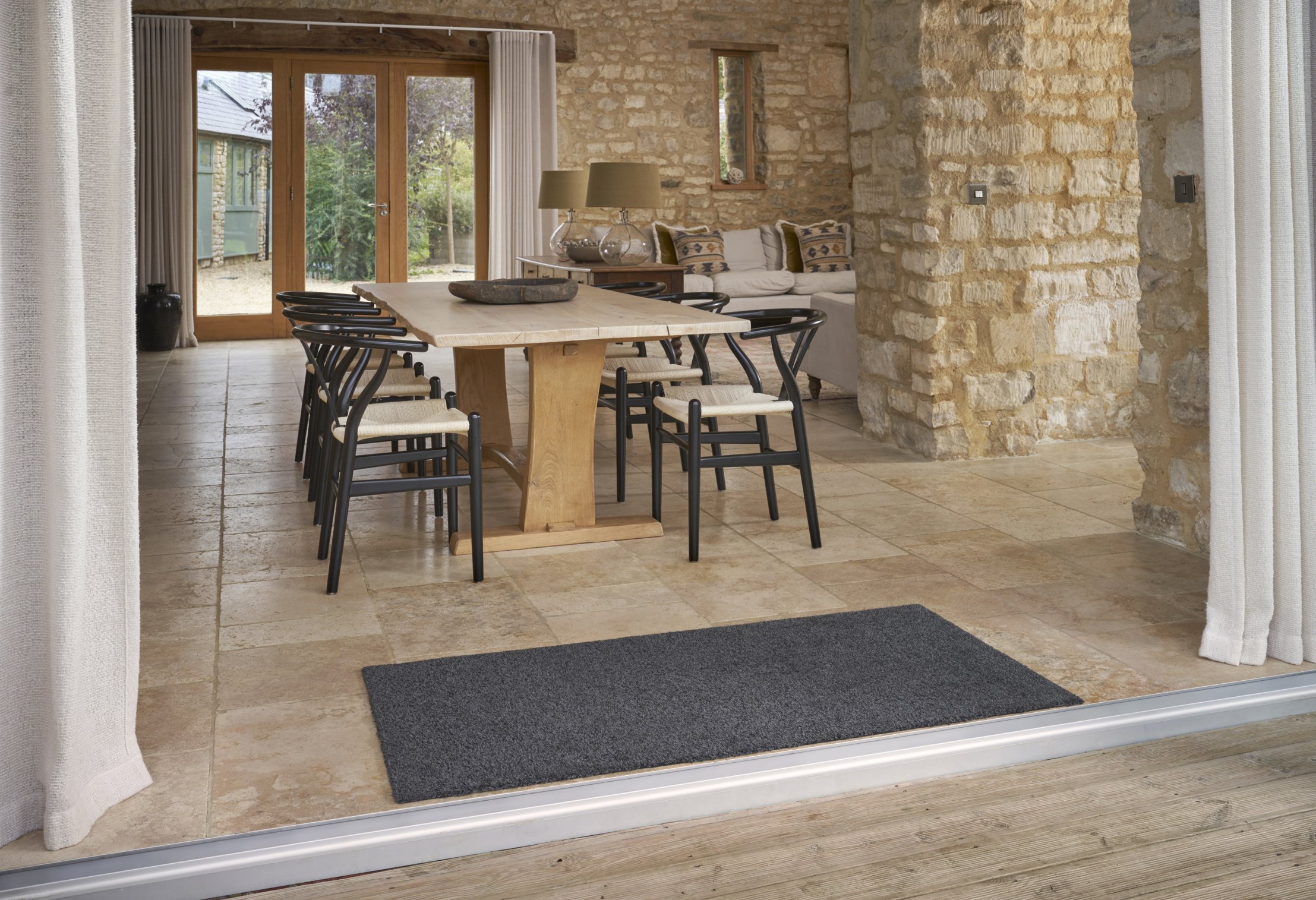 Die Matte besitzt eine geringe Höhe von nur 8 mm und passt so bequem unter fast jede Tür. Ihre rutschfeste, genoppte Nitrilgummi-Rückseite sorgt überall - auch in Feuchträumen - für sicheren Halt. Ideal auch als Futterplatz für Haustiere: Futterreste und Wasser werden effizient aufgefangen, und die Reinigung bleibt unkompliziert.