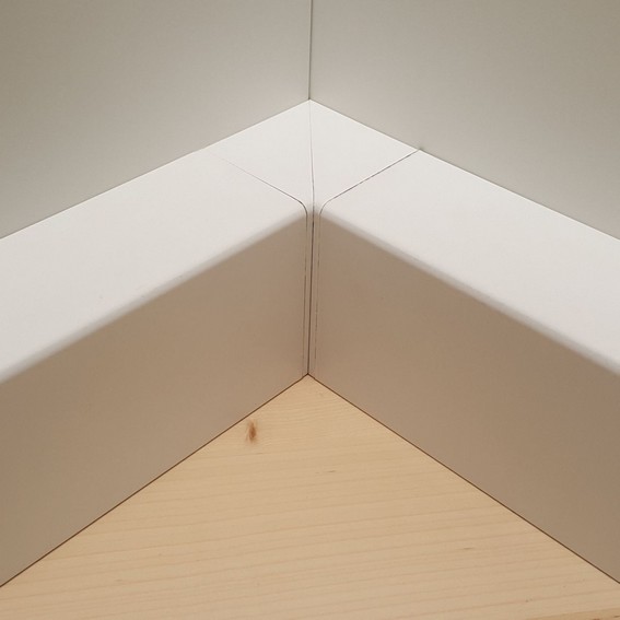 Hinweis: Die Sockelleisten Innenwinkel werden als vorgefertigtes Element geliefert, welches nur noch mittig in zwei Teile getrennt werden muss.