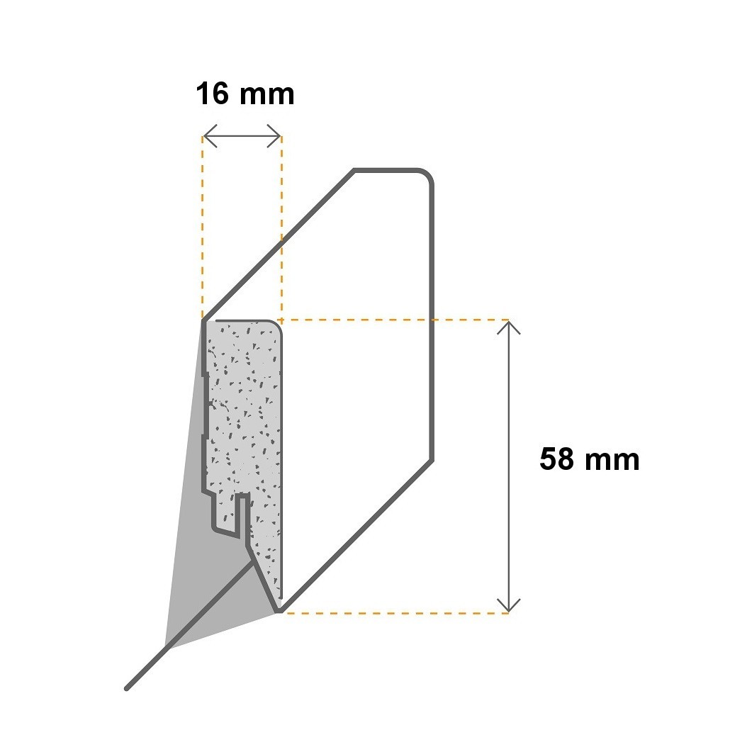 - GRÖSSE: Die Fußleiste mit den Abmessungen 16 x 58 x 2500 mm schafft einen sauberen Übergang zwischen Boden und Wand.