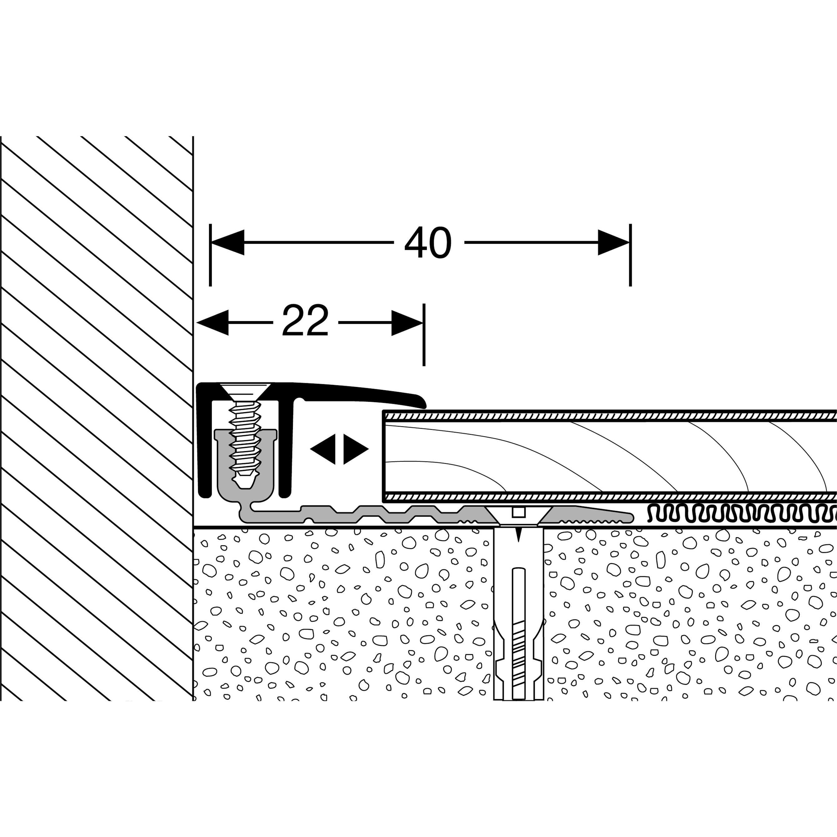 - GRÖSSE: Das Ausgleichsprofil mit den Abmessungen 40 x 6.5 - 16 x 1000 mm hat eine Einfasshöhe von 6.5 - 16 mm.