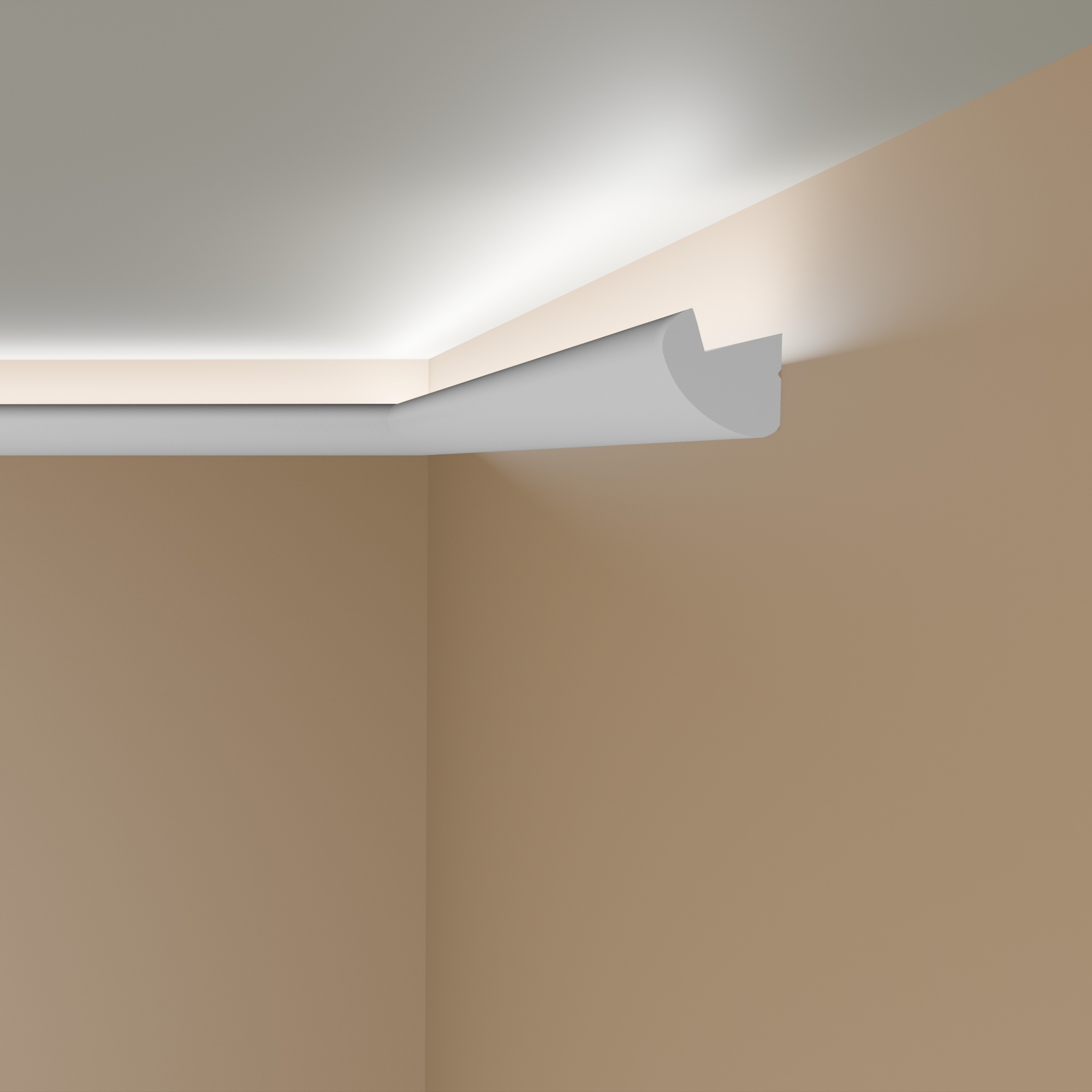 Die Lichtleiste CX188 von ORAC Decor ist eine Lichtleiste aus Duropolymer-Hartschaum, die eigens für die Installation von indirekter Beleuchtung entworfen wurde. Die 34 mm hohe und 30 mm breite stoß- und wasserfeste Stuckleiste für indirekte Beleuchtung formt eine schlicht runde Wölbung und lässt sich nahezu perfekt in jedem Raum einarbeiten. Um Ihr individuelles Lichtkonzept zu realisieren, können Sie in der Nut flexibel LED Streifen Ihrer Wahl einkleben. Durch das harmonische Zusammenspiel aus Licht und Schatten, setzten Sie ein echtes Highlight in jedem Raum.