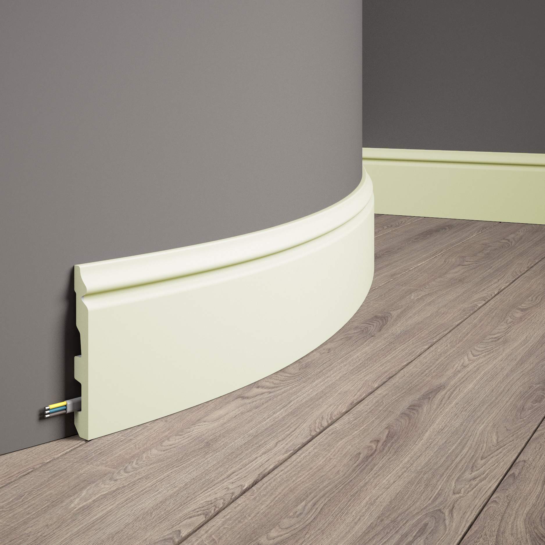 - FARBE: Gelblich. Die flexible Sockelleiste wird erst nach der Montage in die gewünschte Farbe gestrichen, da sich die Farbe aufgrund der elastischen Eigenschaften wieder lösen würde.