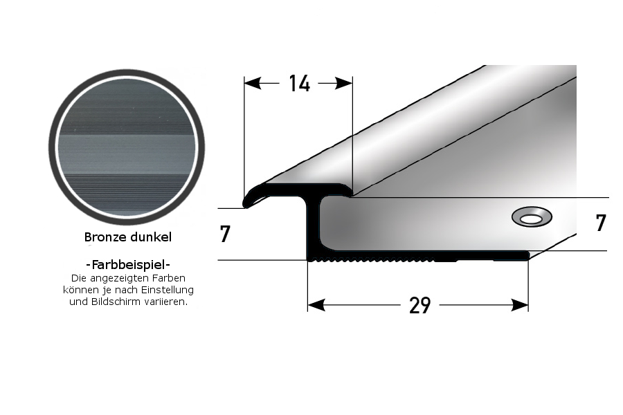- GRÖSSE: Das Abschlussprofil mit den Abmessungen 29 x 7 x 1000 x 7 mm hat eine Einfassung von 7 mm.