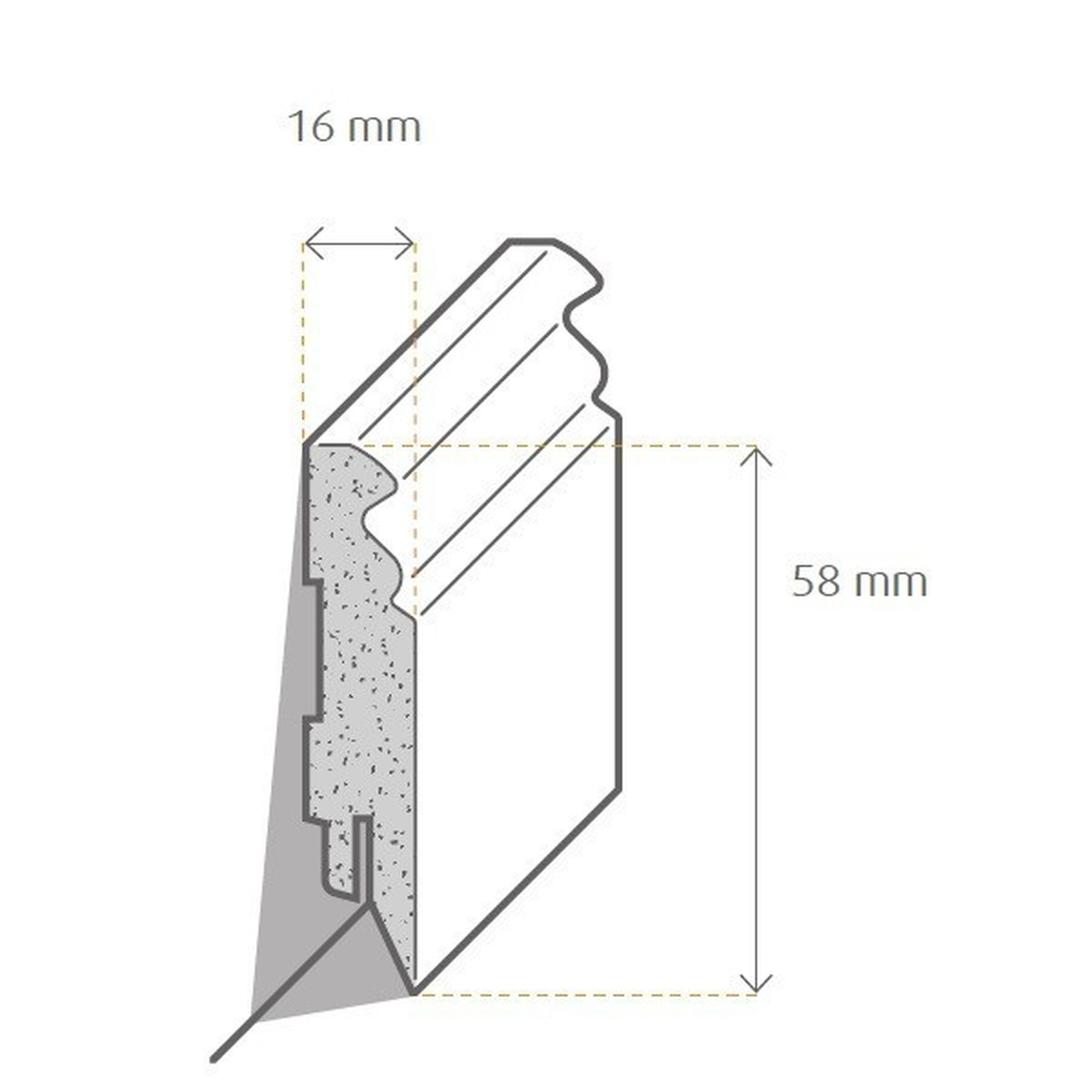 - GRÖSSE: Die Fußleiste mit den Abmessungen 16 x 58 x 2500 mm schafft einen sauberen Übergang zwischen Boden und Wand.