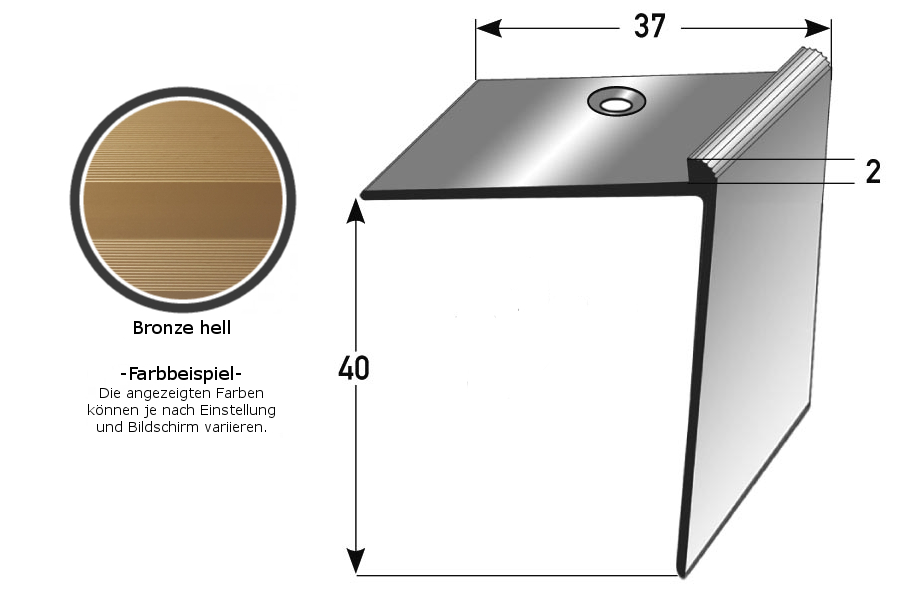 - GRÖSSE: Das Winkelprofil mit den Abmessungen 37 x 40 x 2700 mm hat eine Einfasshöhe von 2 mm und schafft einen sauberen Abschluss an der Treppenkante.
