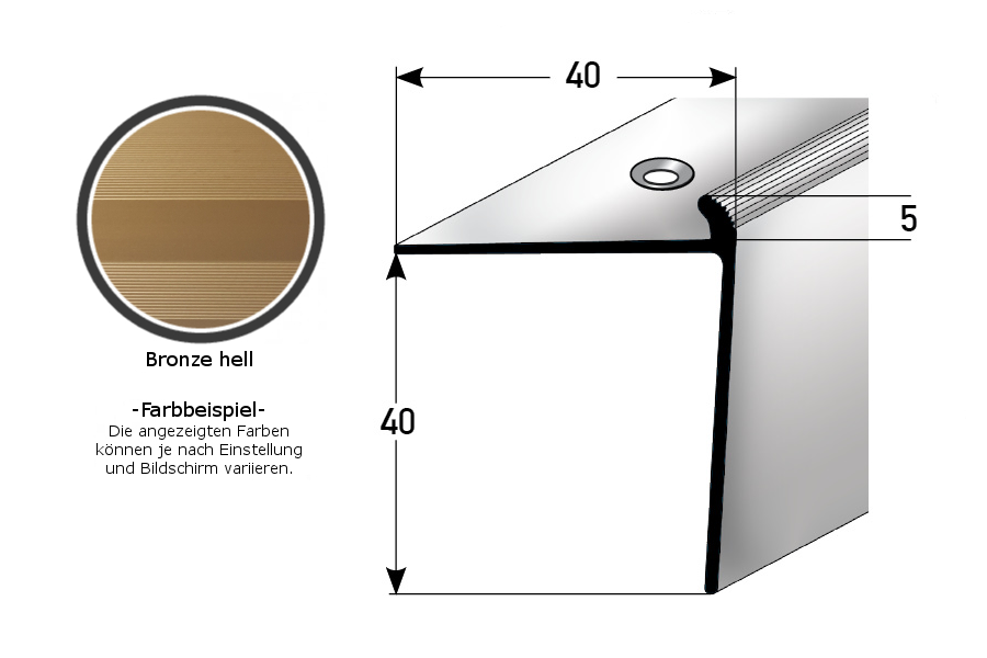 - GRÖSSE: Das Winkelprofil mit den Abmessungen 40 x 5 x 2700 mm besitzt eine Einfasshöhe von 5 mm und schafft einen sauberen Abschluss an der Treppenkante.