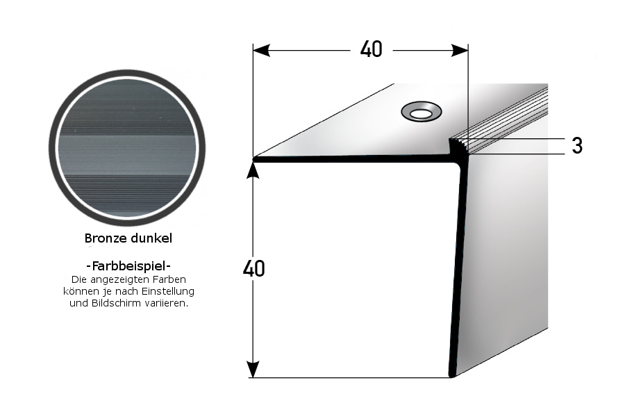 - GRÖSSE: Das Winkelprofil mit den Abmessungen 40 x 3 x 1000 mm besitzt eine Einfasshöhe von 3 mm und schafft einen sauberen Abschluss an der Treppenkante.