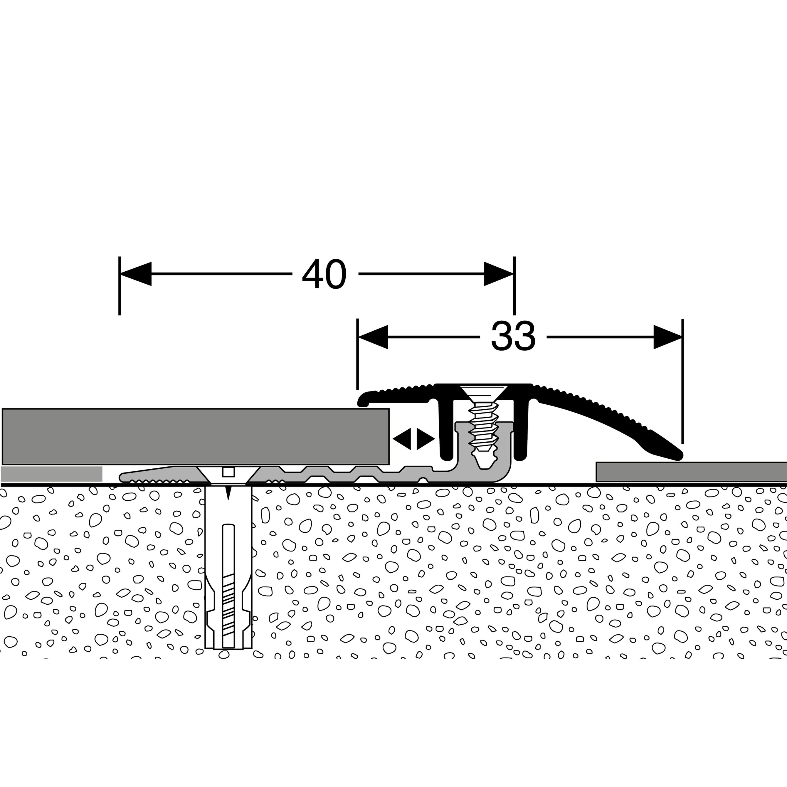 - GRÖSSE: Das Übergangsprofil mit den Abmessungen 33 x 4 - 9.5 x 900 mm besitzt eine Einfasshöhe von 4 - 9.5 mm und schafft einen sauberen Übergang zwischen verschiedenen Bodenbelägen.
