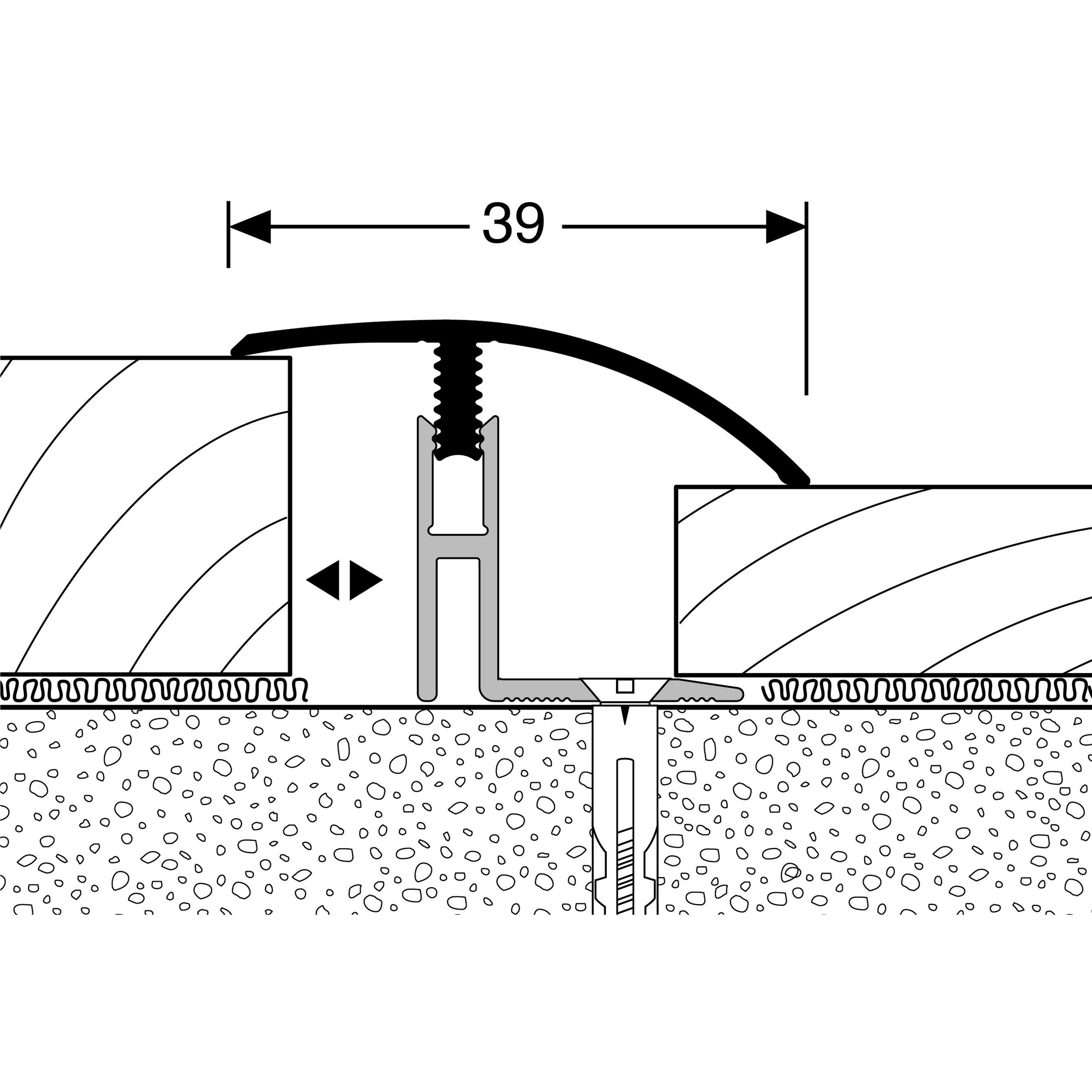 - GRÖSSE: Das Übergangsprofil mit den Abmessungen 39 x 17 - 22 x 1000 mm besitzt eine Einfasshöhe von 17 - 22 mm und schafft einen sauberen Übergang zwischen verschiedenen Bodenbelägen.