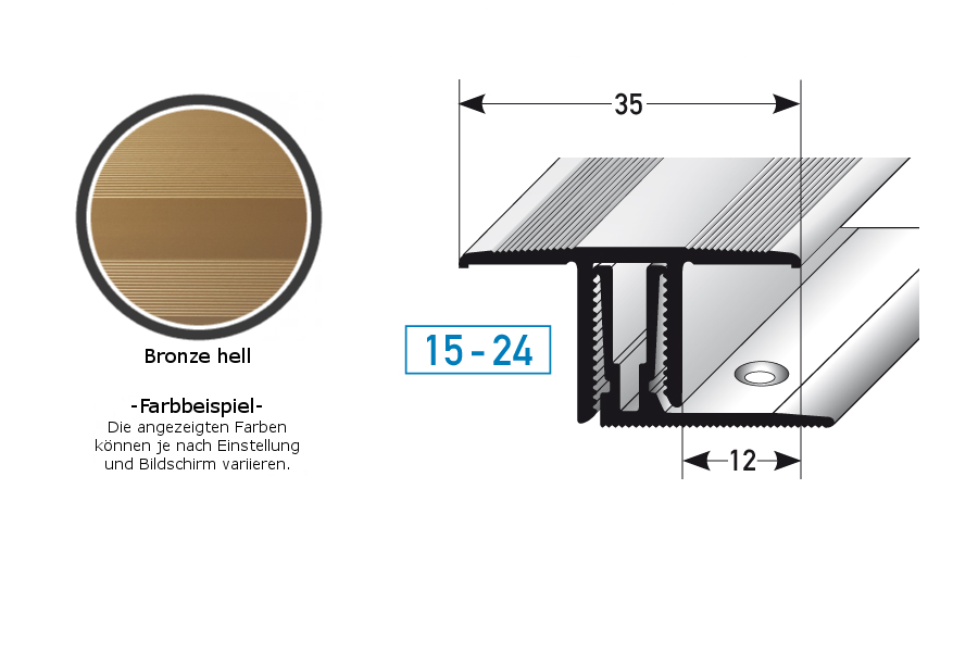- GRÖSSE: Das Übergangsprofil mit den Abmessungen 35 x 15 - 24 x 900 mm besitzt eine Einfasshöhe von 15 - 24 mm und schafft einen sauberen Übergang zwischen verschiedenen Bodenbelägen.
