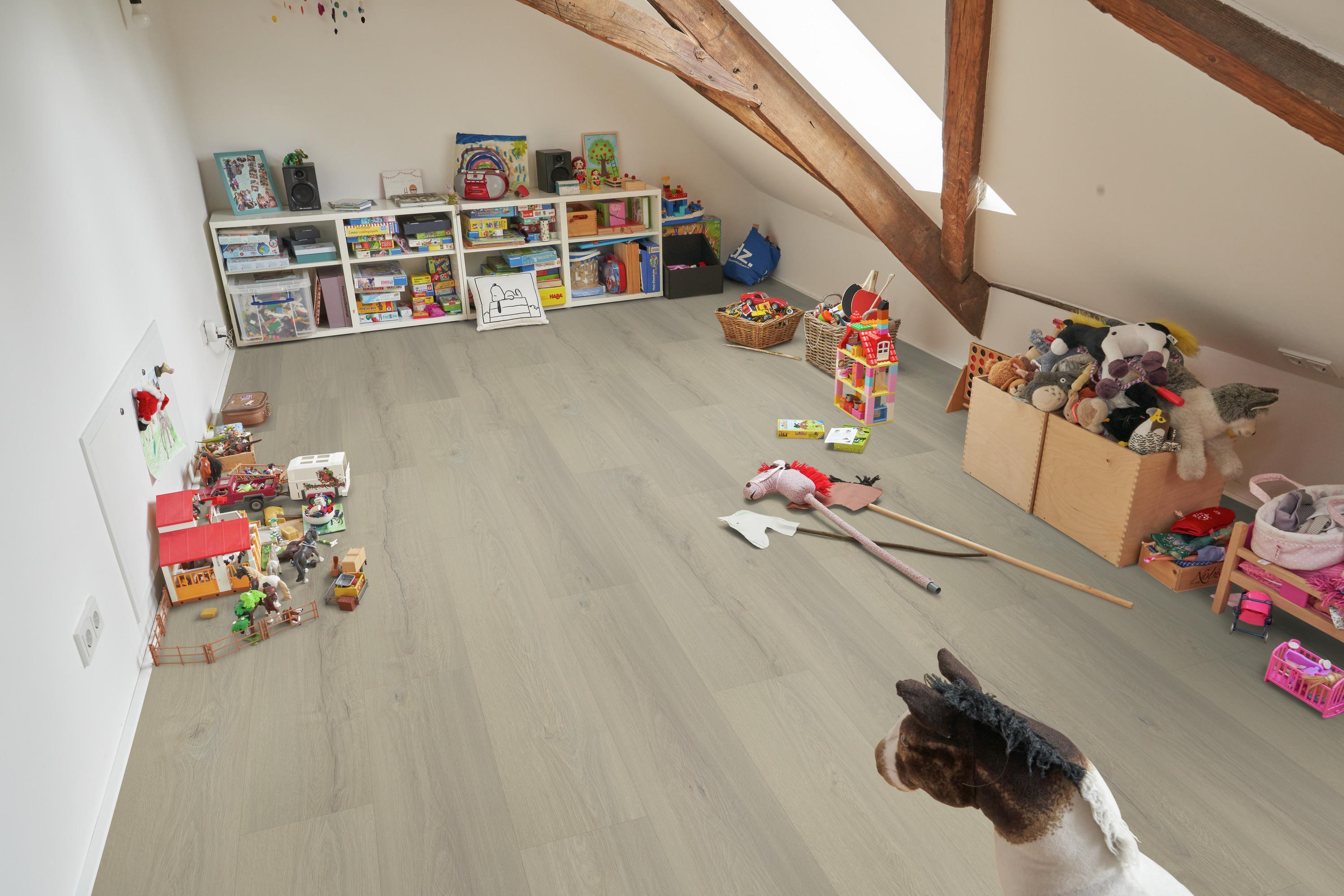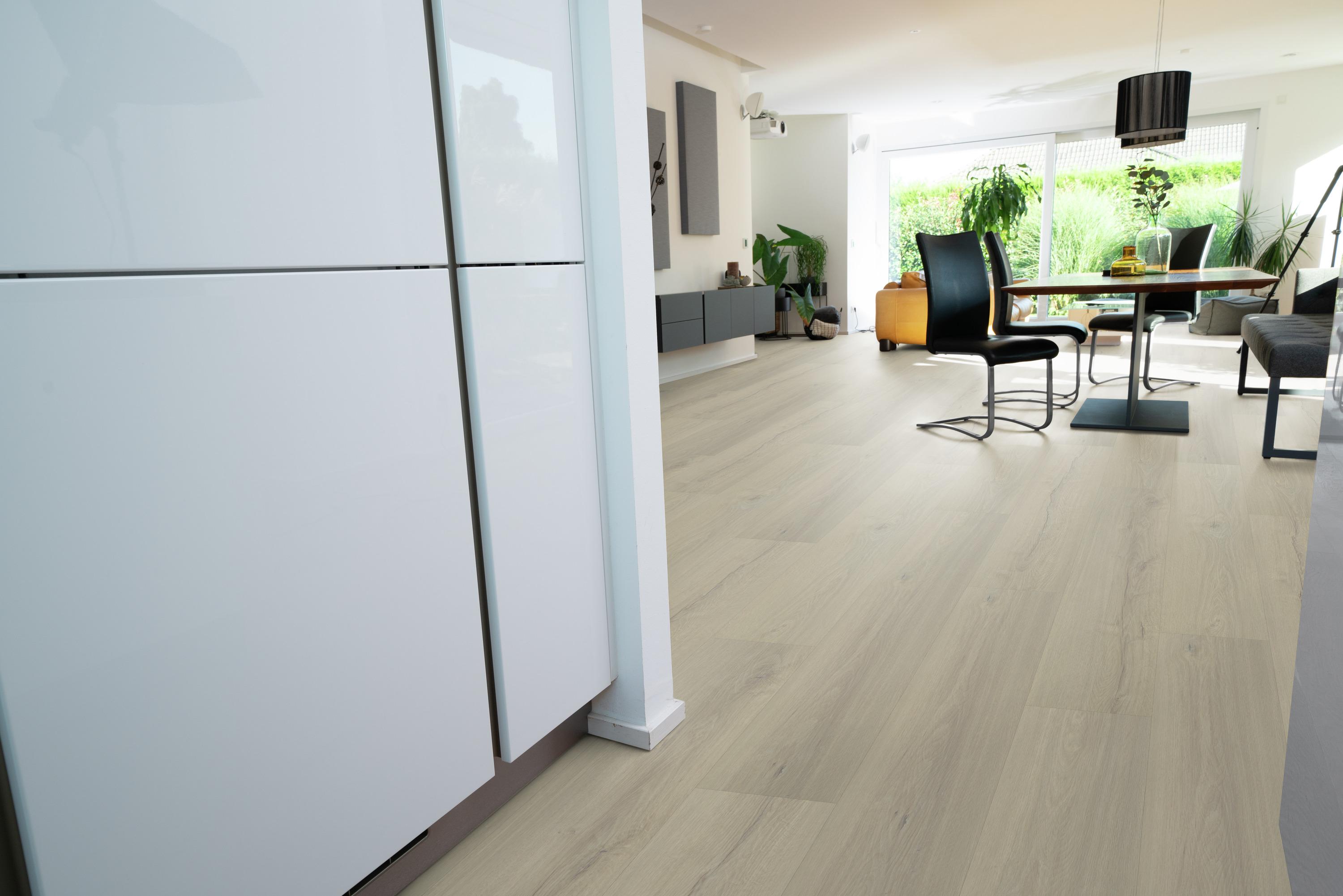 - HOCHBELASTBAR: Vinylboden mit Trägerplatte und integrierter Trittschalldämmung