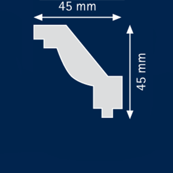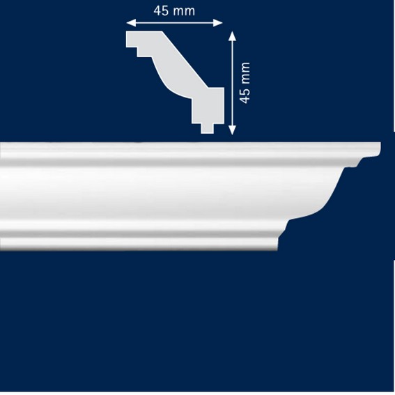 Bei diesem Artikel handelt es sich um die Stuckleiste Monterey des Herstellers Wiesemann aus Polystyrol. Es ist eine 45 x 45 mm messende Styroporstuckleiste (Polstyrol), die im modernen Stil gestalte wurde. Die aus extrudiertem Polystyrol (Styropor) gefertigte Stuckleiste ist trotz des geringen Gewichts hart und relativ druckfest. Die Eckleiste überzeugt mit Ihrer passgenauen Kontur und ihrer glatten Oberfläche.