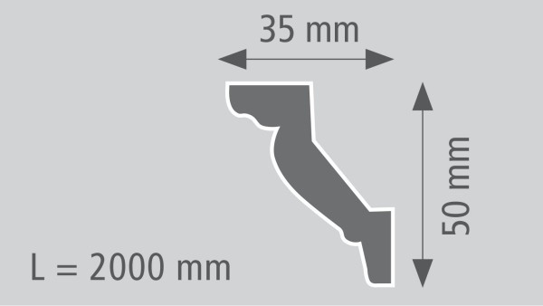 Bei diesem Artikel handelt es sich um die Stuckleiste San Fernando des Herstellers Wiesemann aus Polystyrol. Es ist eine 35 x 50 mm messende Styroporstuckleiste (Polstyrol), die im modernen Stil gestalte wurde. Die aus geschäumtem Polystyrol (Styropor) gefertigte Stuckleisteiste ist perfekt zur harmonischen Gestaltung von Wohn- und Gewerberäumen.
