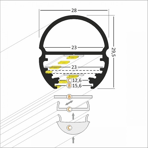 GRÖSSE: Das LED Aluminiumprofil mit den Abmessungen 28 x 29.5 x 2000 mm ist geeignet für LED Stripes mit einer Breite von maximal 23 mm
