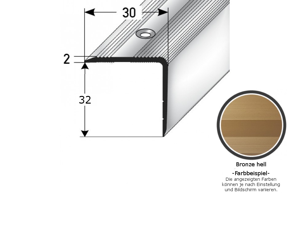 - GRÖSSE: Das Winkelprofil mit den Abmessungen 32 x 30 x 1000 mm hat eine Materialstärke von 2 mm und schafft einen sauberen Abschluss an der Treppenkante.