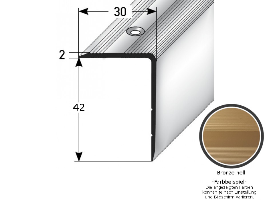 - GRÖSSE: Das Winkelprofil mit den Abmessungen 42 x 30 x 2700 mm hat eine Materialstärke von 2 mm und schafft einen sauberen Abschluss an der Treppenkante.