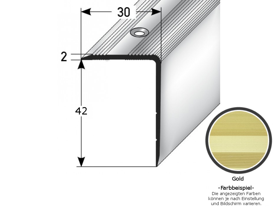 - GRÖSSE: Das Winkelprofil mit den Abmessungen 42 x 30 x 2700 mm hat eine Materialstärke von 2 mm und schafft einen sauberen Abschluss an der Treppenkante.