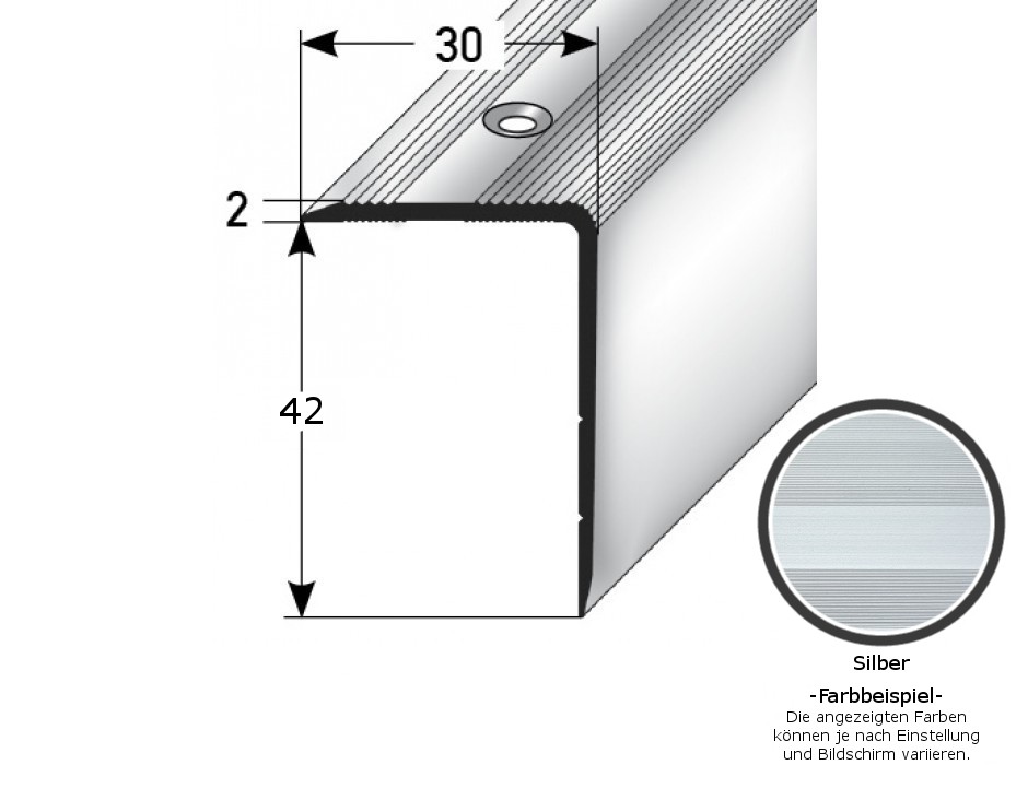 - GRÖSSE: Das Winkelprofil mit den Abmessungen 42 x 30 x 2700 mm hat eine Materialstärke von 2 mm und schafft einen sauberen Abschluss an der Treppenkante.
