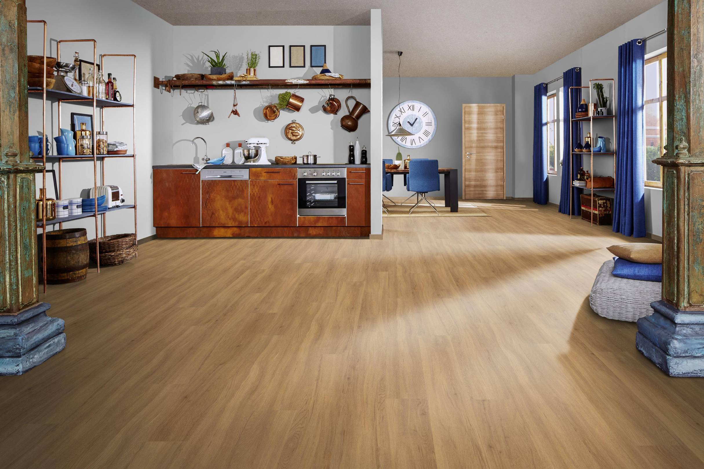 Dank seiner 100%igen Wasserfestigkeit ist dieser Bodenbelag auch perfekt für Feuchträume wie das Badezimmer geeignet. Die Verlegung erfordert einen gespachtelten Untergrund, auf den die einzelnen Planken mit einem Designbelagskleber sicher verklebt werden. Die Kollektion bietet Planken in unterschiedlichen Größen und Designs, darunter Fliesen- und Dielenformate sowie vielfältige Stein- und Holzoptiken. Wählen Sie nach Ihrem persönlichen Geschmack und den Anforderungen des Raumes.
