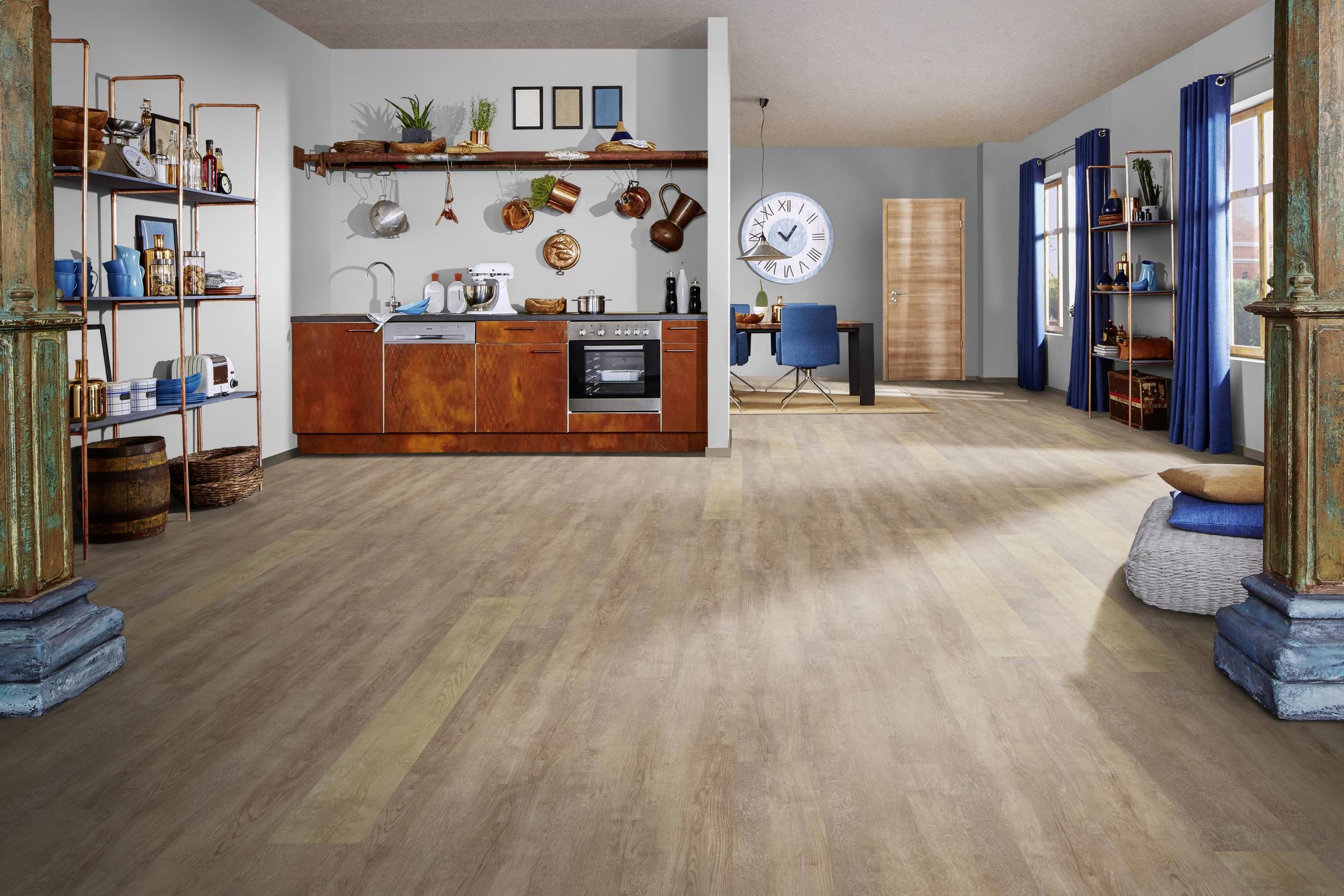 Dank seiner 100%igen Wasserfestigkeit ist dieser Bodenbelag auch perfekt für Feuchträume wie das Badezimmer geeignet. Die Verlegung erfordert einen gespachtelten Untergrund, auf den die einzelnen Planken mit einem Designbelagskleber sicher verklebt werden. Die Kollektion bietet Planken in unterschiedlichen Größen und Designs, darunter Fliesen- und Dielenformate sowie vielfältige Stein- und Holzoptiken. Wählen Sie nach Ihrem persönlichen Geschmack und den Anforderungen des Raumes.